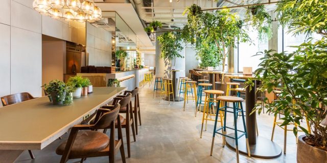 開放的な一面の大きなガラス窓からは暖かい自然光が降り注ぎ、親しみやすい