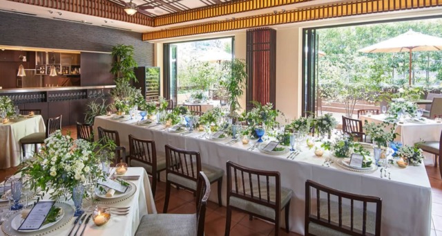 その中にあるレストラン『東山庭(ヒガシヤマガーデン)』は、訪れる人が落ち着いて過ごせる優しいブラウン、優しいグリーンを感じられ、大きな窓からは太陽の光が差し込み、お二人のパーティーを明るく照らしてくれます。