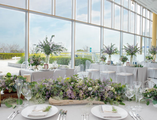全面ガラス張りの開放的なロケーションと透明感溢れる店内で料理にこだわったアットホームウェディングが叶います。