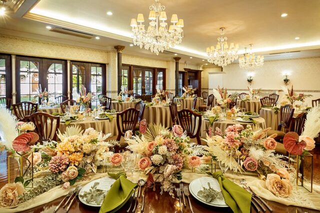 1日1組だけで邸宅を貸切れる KASANE HIROSHIMAでのウエディングパーティーは、プライベート空間で大切なゲストと誰にも邪魔されずゆったりとお過ごし頂けます。また、パーティー会場から繋がる広々としたお庭では日常を忘れ非日常的な時間が叶うと人気です